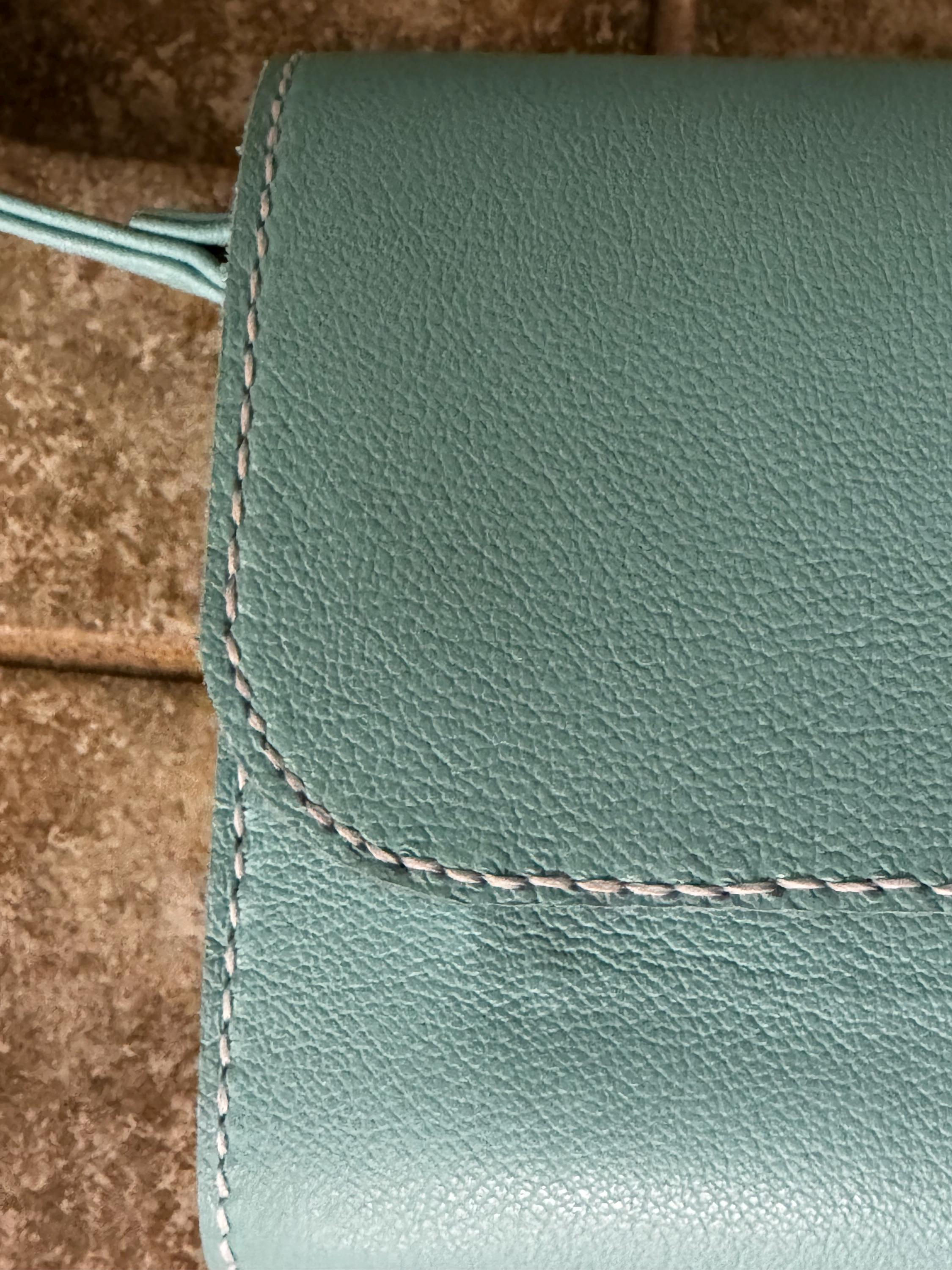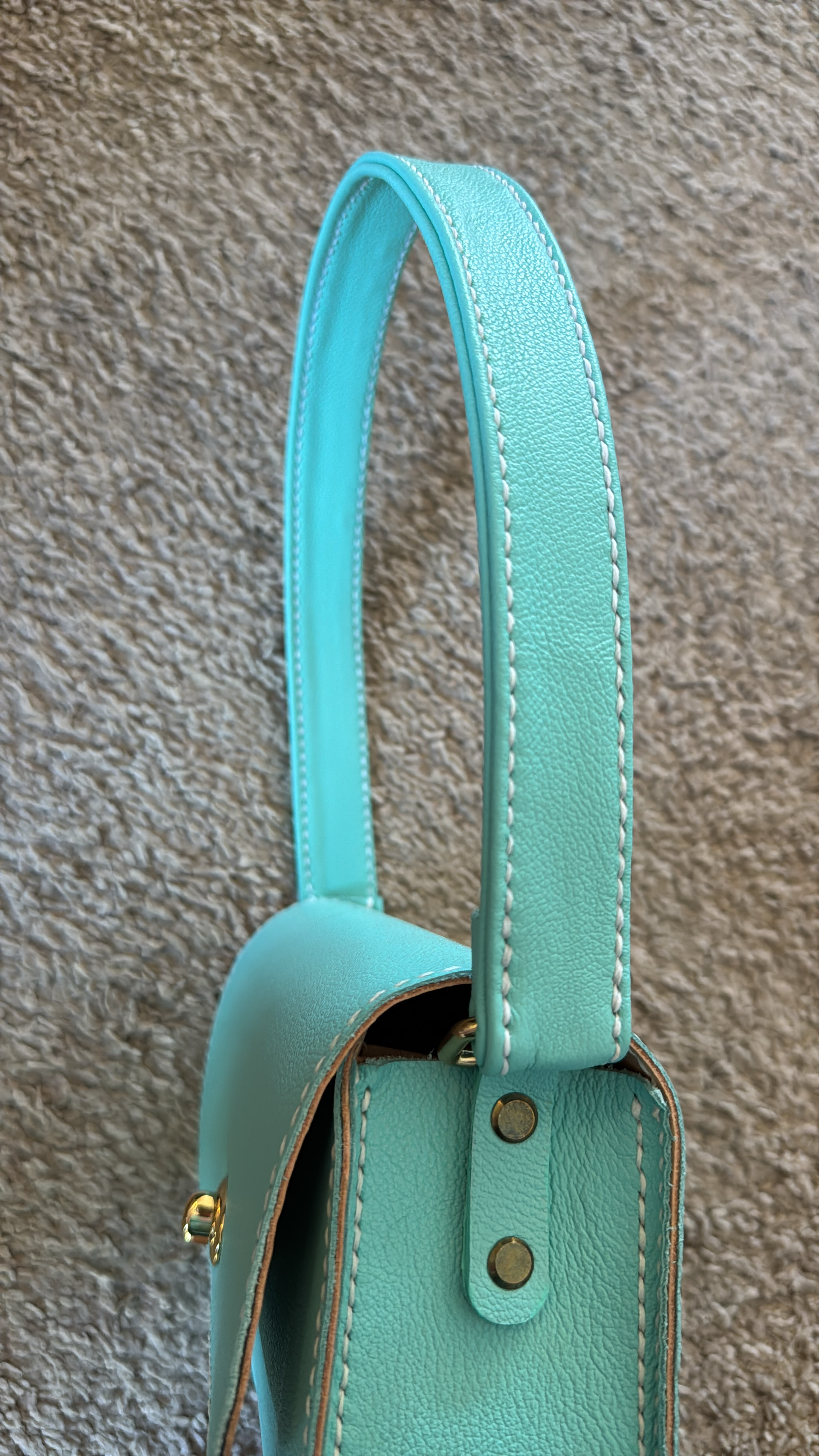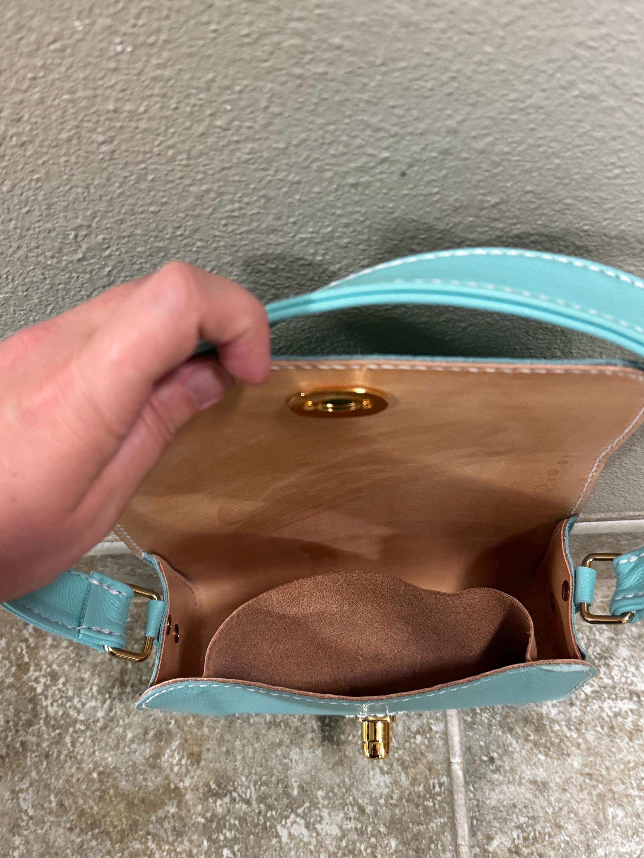 This gorgeous lined blue purse is made from the same soft leather as our large quilted blue tote. Lined with vegtan leather to give the bag structure, the pocket inside helps keep everything organized. The gold toned turn lock clasp is easy to open but keeps unwanted hands out of your purse. Same design as our black and red purse, but with a shorter matching handle.