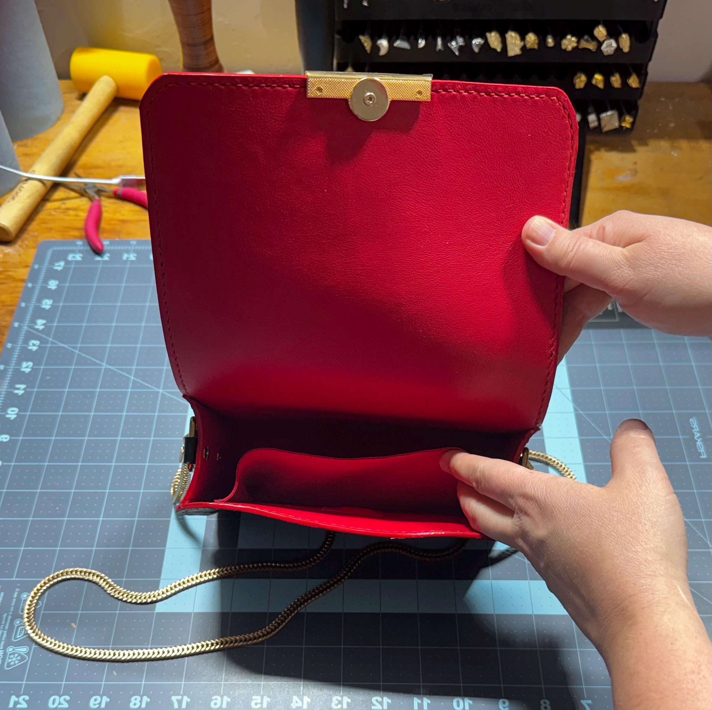 This gorgeous black and red leather purse has just the right amount of pizzaz to set off your outfit! It’s made with a textured, imported Italian black leather on the outside and lined with soft red leather. Red stitching and red edge finishing set off the contrasting colors. It’s finished with a shiny gold colored magnetic snap, and paired with a matching gold chain. It can be worn as a cross body or single shoulder style purse. It easily goes from office to after work drinks!