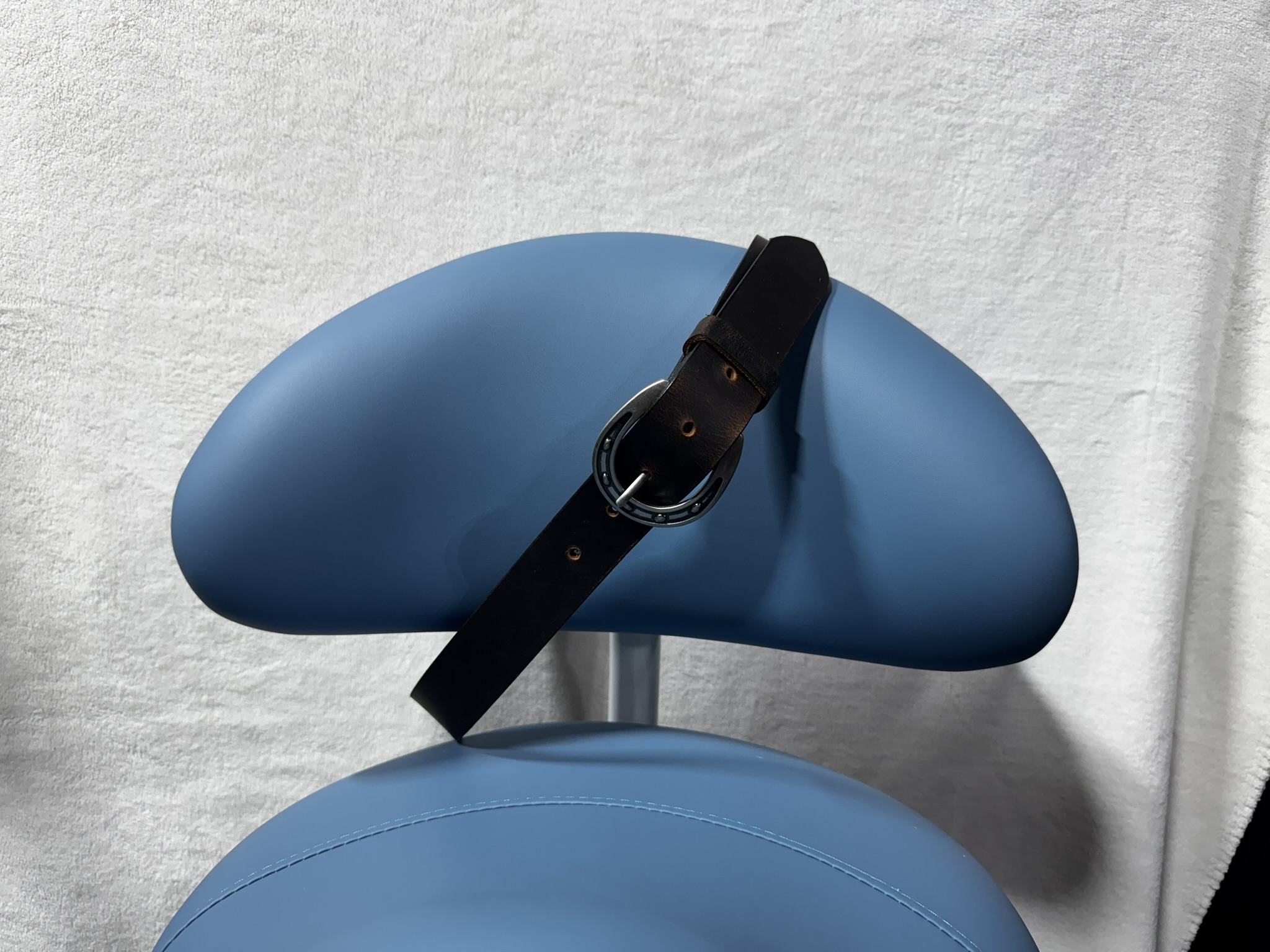 This belt is made from sturdy, long lasting buffalo leather. It has a dark brown finish with a silver colored horse shoe buckle. Belt holes are spaced 1 inch apart. Belt is 1.5 inches wide. This belt will look great with jeans or business casual. Want a different buckle? Message us and we’ll get it sorted for you.