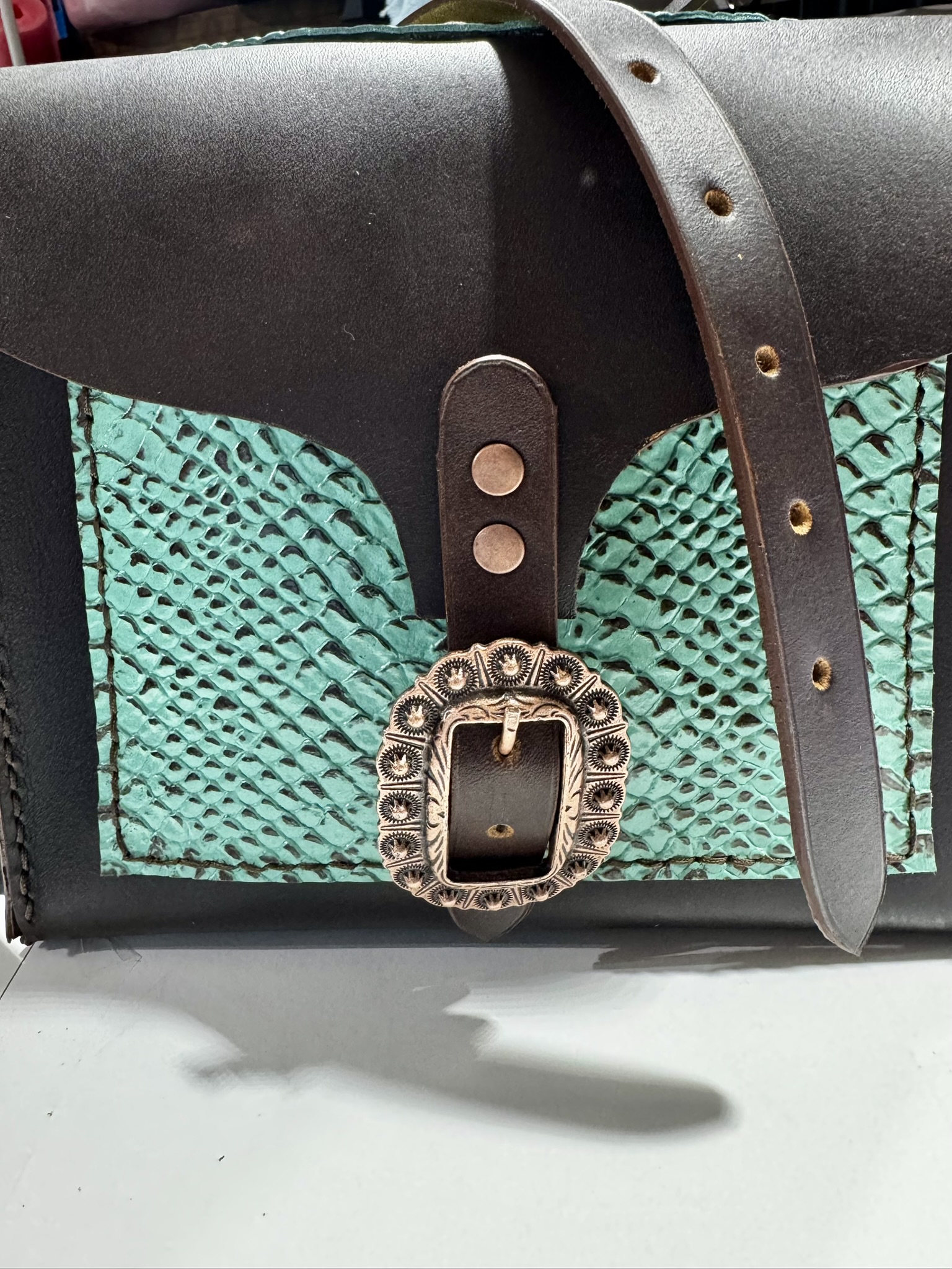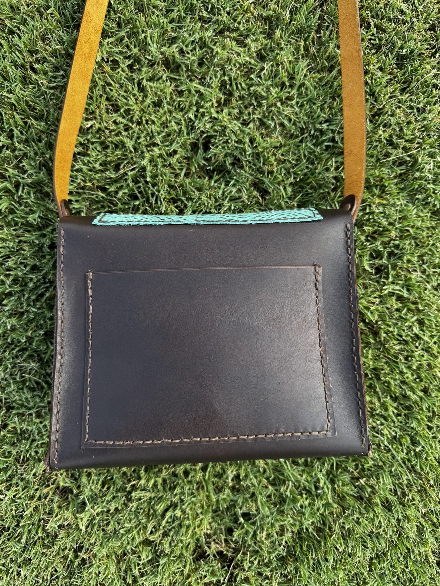 The awesome interior contains a zippered pocket, pen pouch and a lipstick pouch – no more errant lipstick caps and melted messes! The secure buckle closure is perfect for keeping unwanted hands from stealing items out of your purse, while the phone pocket in the back keeps your phone handily against your body. Shoulder strap is adjustable and measures 41-46 inches. The dark brown leather has a high wax and oil content; this keeps the leather looking beautiful longer. Occasionally some of the waxes may solidify outside the leather. This can be removed by using a soft bristled brush or a little bit of heat from a blow dryer.