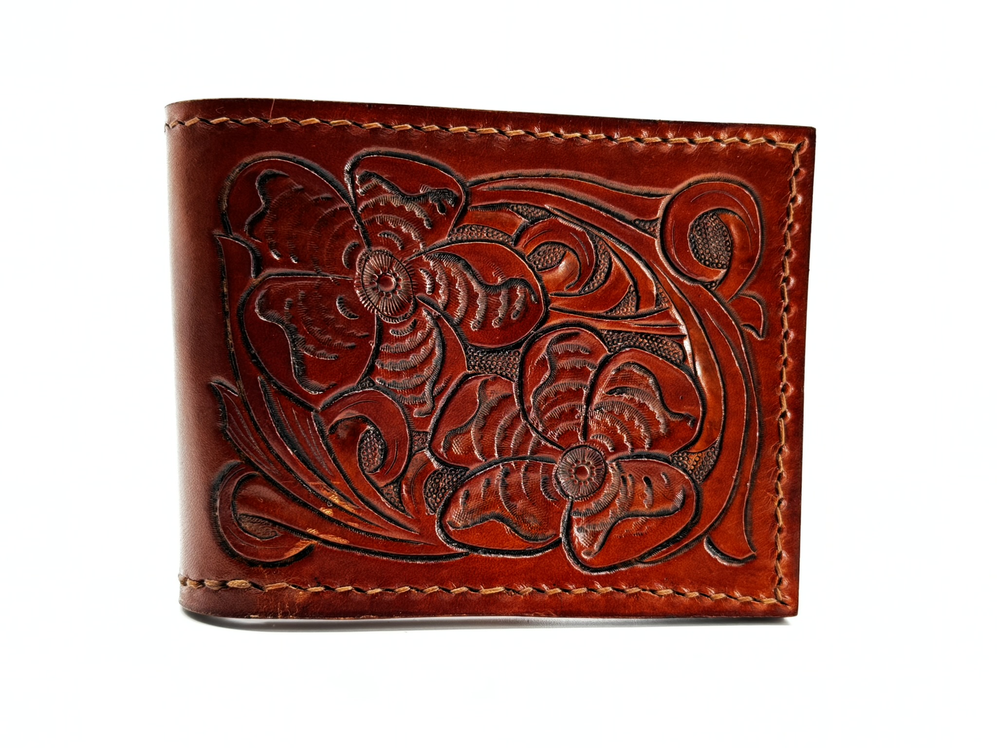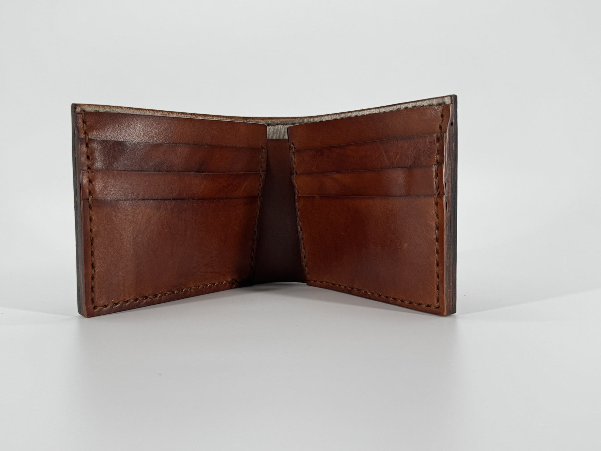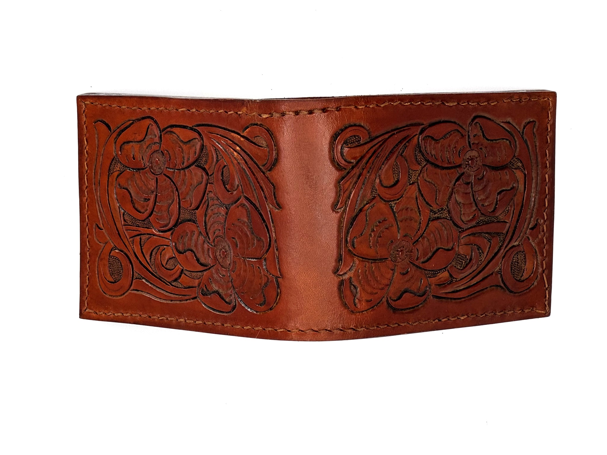 This wallet is for the discerning man who isn’t satisfied with just a regular wallet. Two designs are available. Made from cowhide, each wallet takes several hours to trace, carve, bevel, accent, dye, and hand finish. The six card pockets will soften as they break in. The golden brown color will develop a gorgeous patina with time. These premium wallets also include an RFID blocker. This is visible as the metallic silver liner inside the cash pocket.