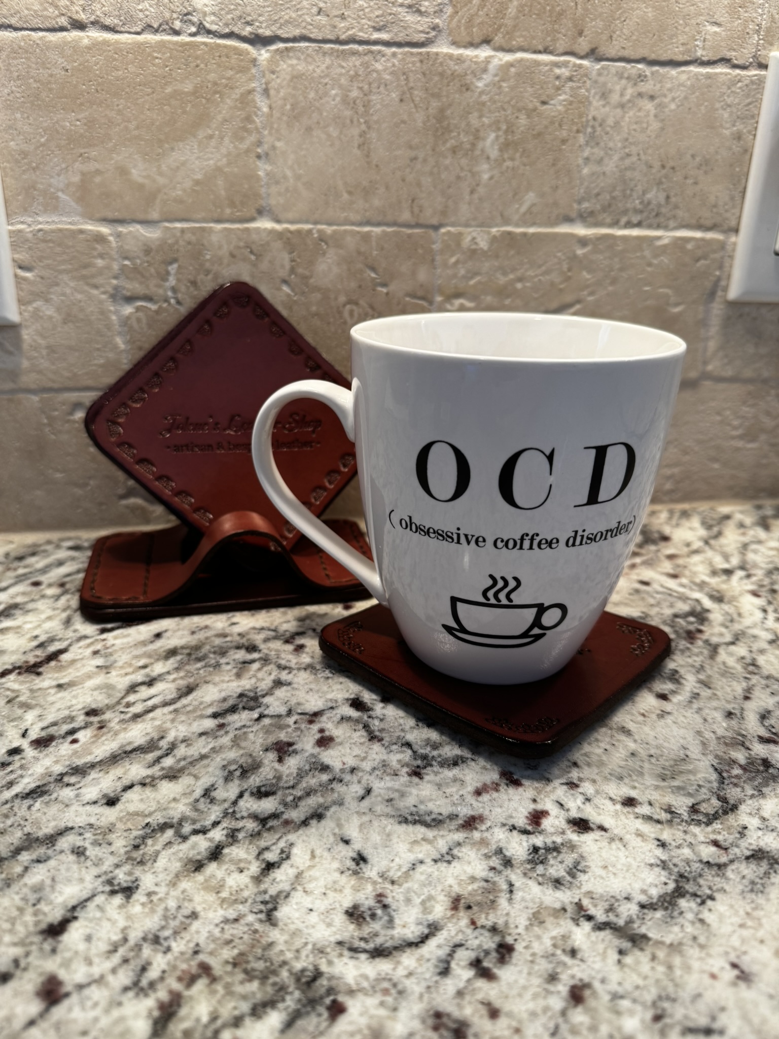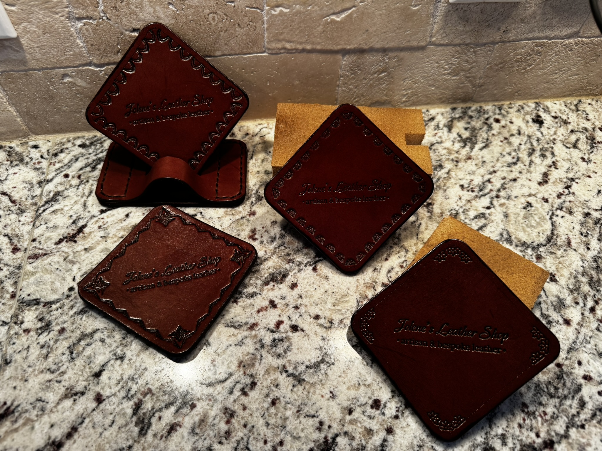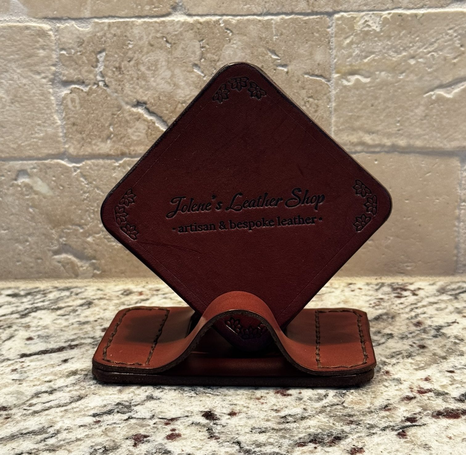 Made from Hermann Oak Chocolate skirting leather, these coasters are the perfect gift. The coaster stand can also be used as a desktop business card holder.