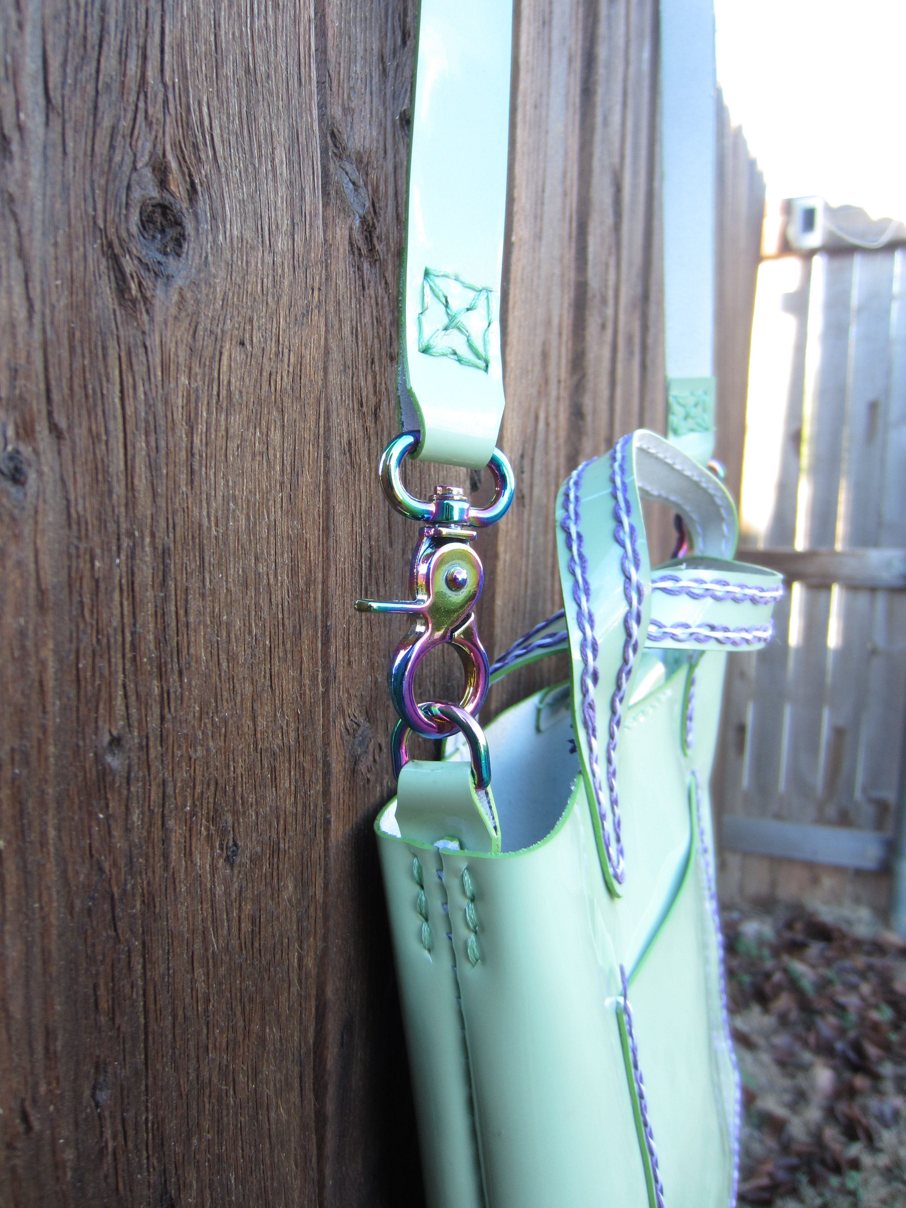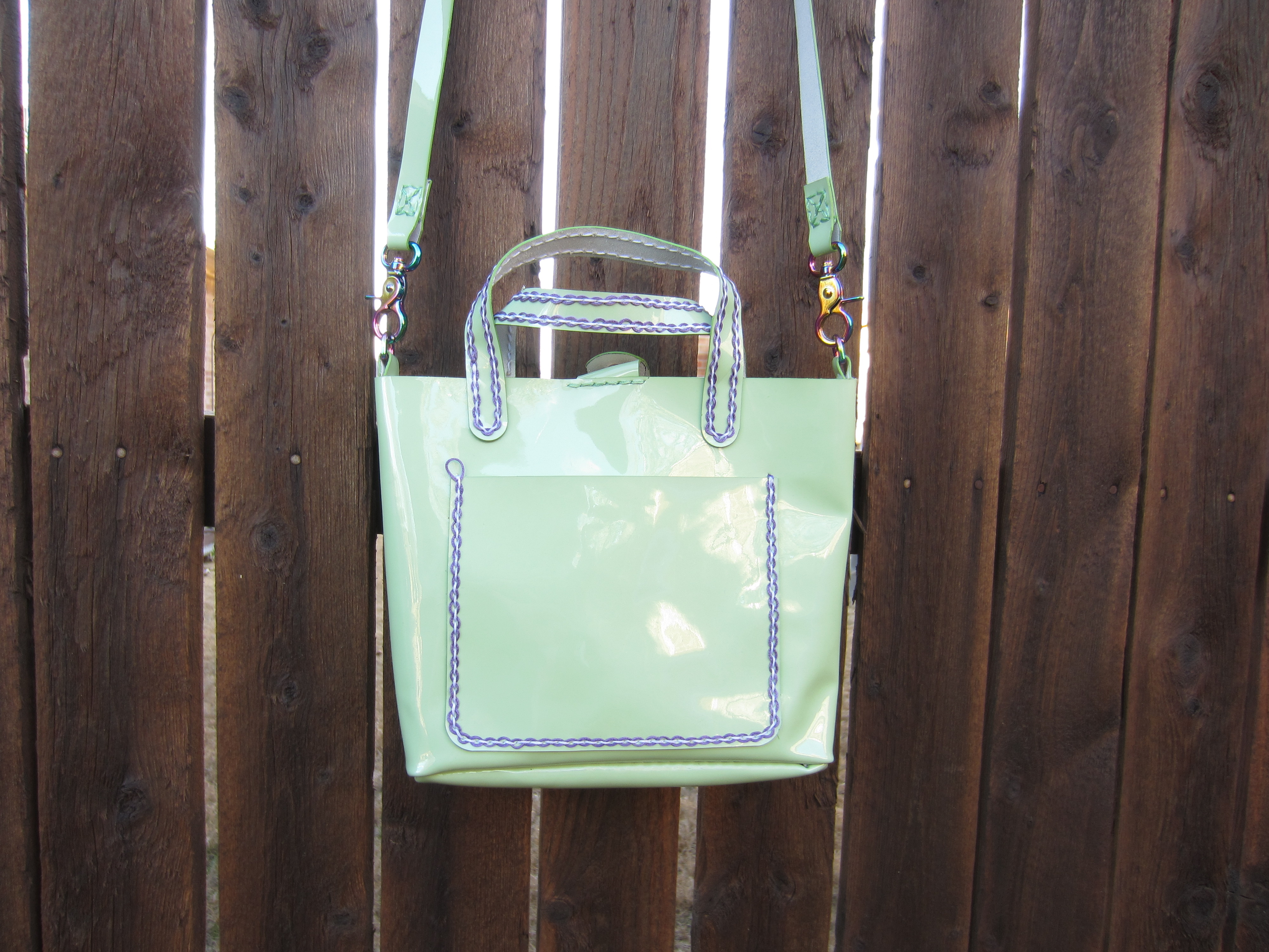St Patrick’s Day and Easter are covered with this cute mini tote that could also serve as an Easter basket for a special young lady. The contrast stitching is set off perfectly by the rainbow hardware. Keep your cell phone handy with one of the two exterior pockets; the detachable cross body strap gives you style and carrying options. It’s made from lightweight vinyl that won’t slow you down no matter where you go. With only one remaining of this limited edition available, don’t hesitate! Measures 7.5 inches wide, 9.5 inches tall and 1.5 inches across at the base. Adjustable crossbody strap is 42-46 inches. Hand stitched.