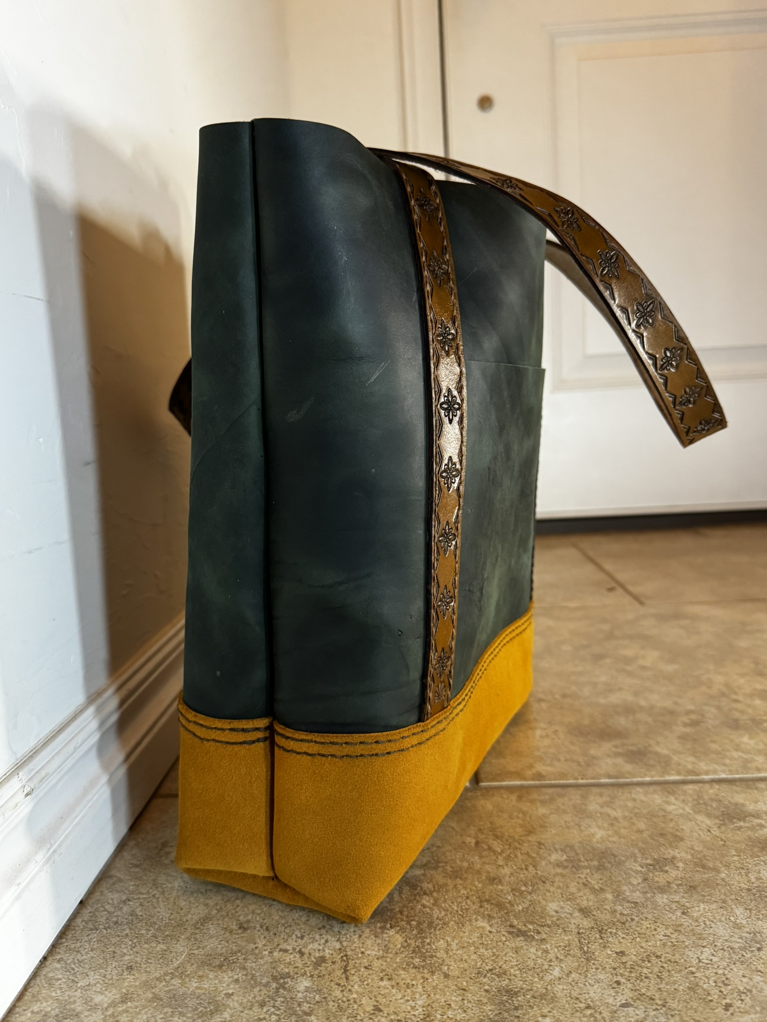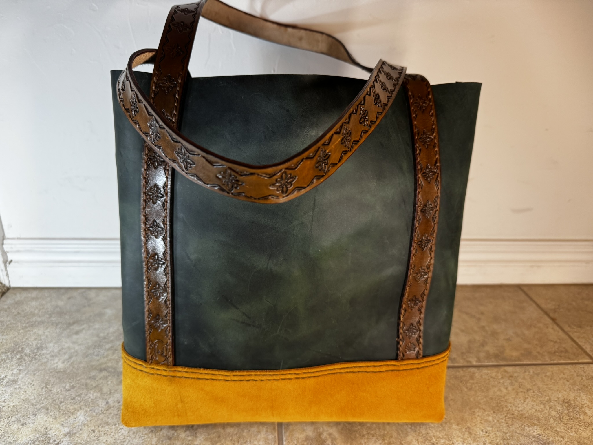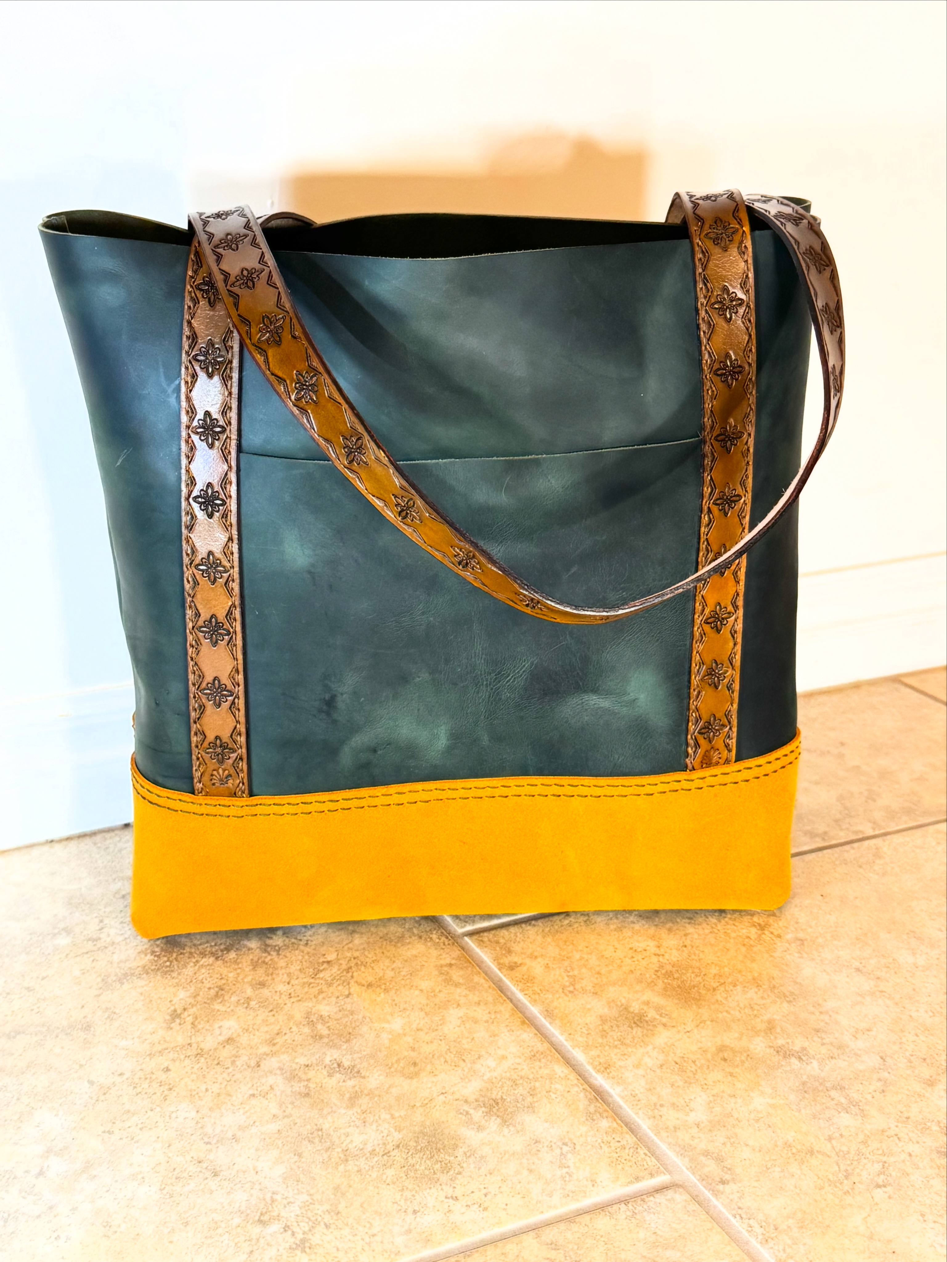 This handmade tote uses three kinds of leather to create a one of a kind look that’s perfect for fall. Measures 14 X 15 X 5 with a generous 8×7 exterior pocket. Four brass feet keep this tote upright. Stamped leather handles add stylish flair you won’t find anywhere else!