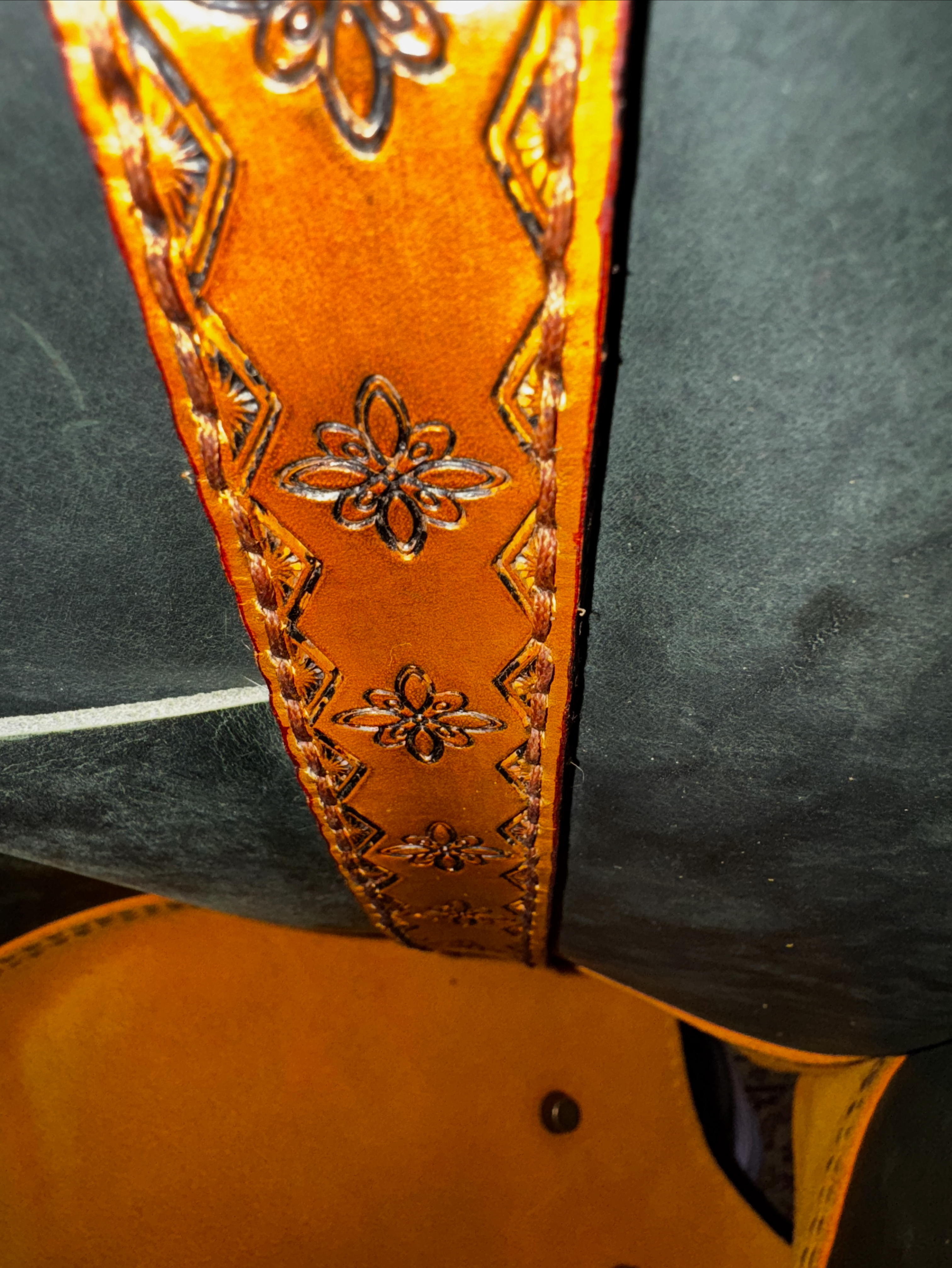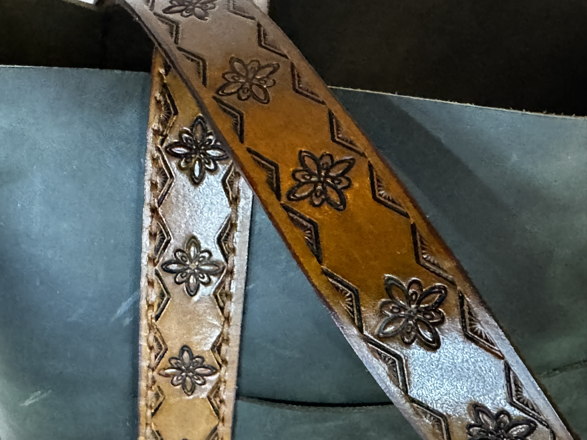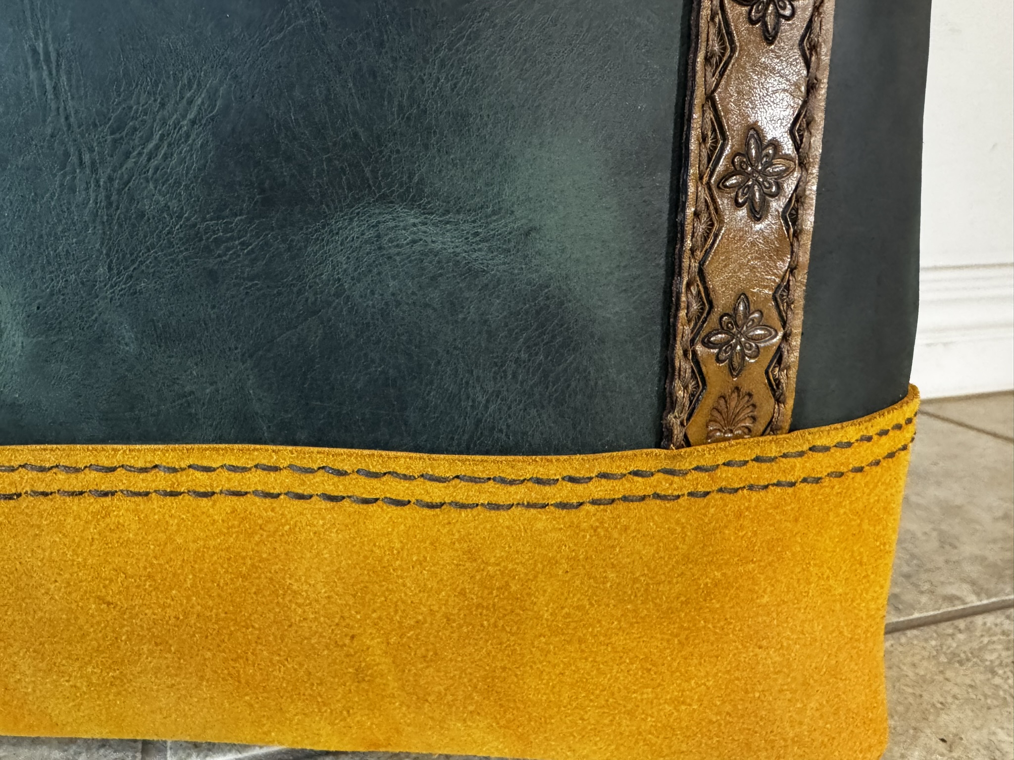 This handmade tote uses three kinds of leather to create a one of a kind look that’s perfect for fall. Measures 14 X 15 X 5 with a generous 8×7 exterior pocket. Four brass feet keep this tote upright. Stamped leather handles add stylish flair you won’t find anywhere else!