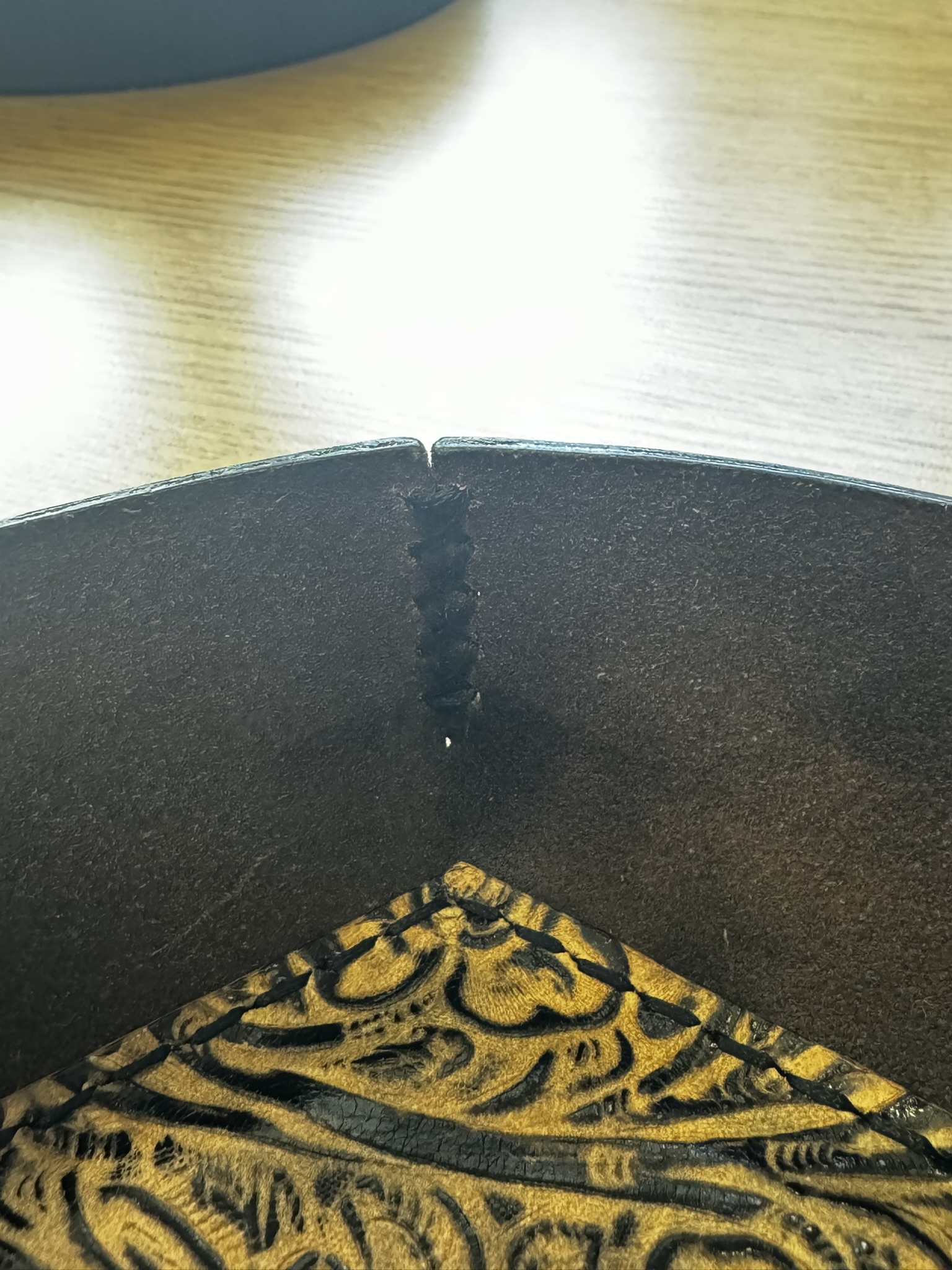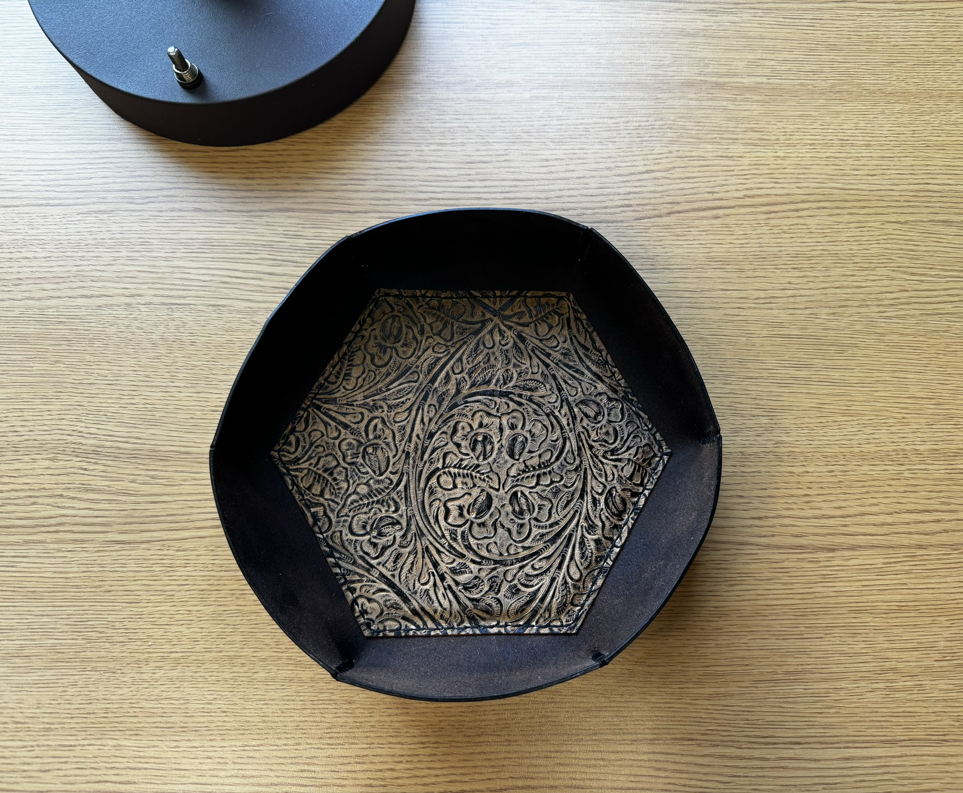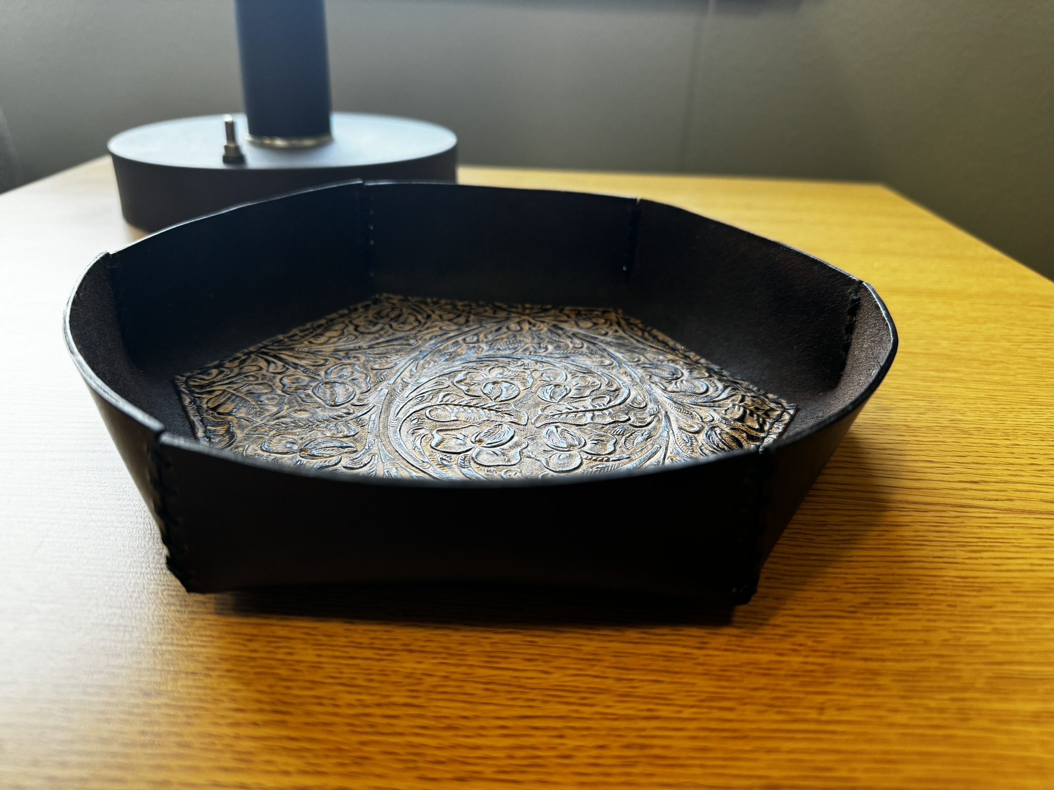 This handcrafted leather valet tray is made by hand in the US. Embossed leather is padded prior to being sewn into the base of the tray. The padding protects your furniture from scratches when you use this tray for pocket contents like keys and spare change. Pretty and functional, this will last for years!