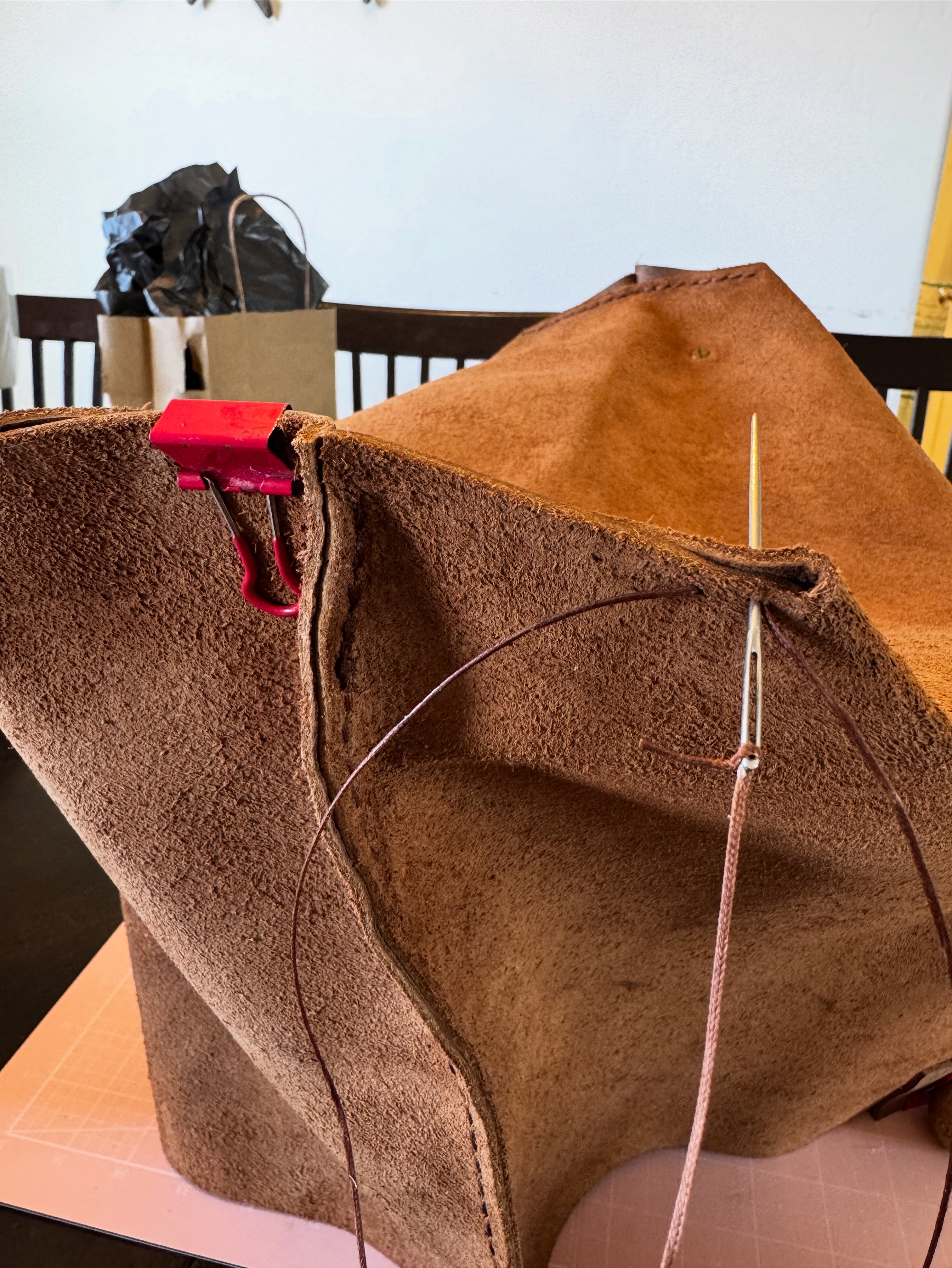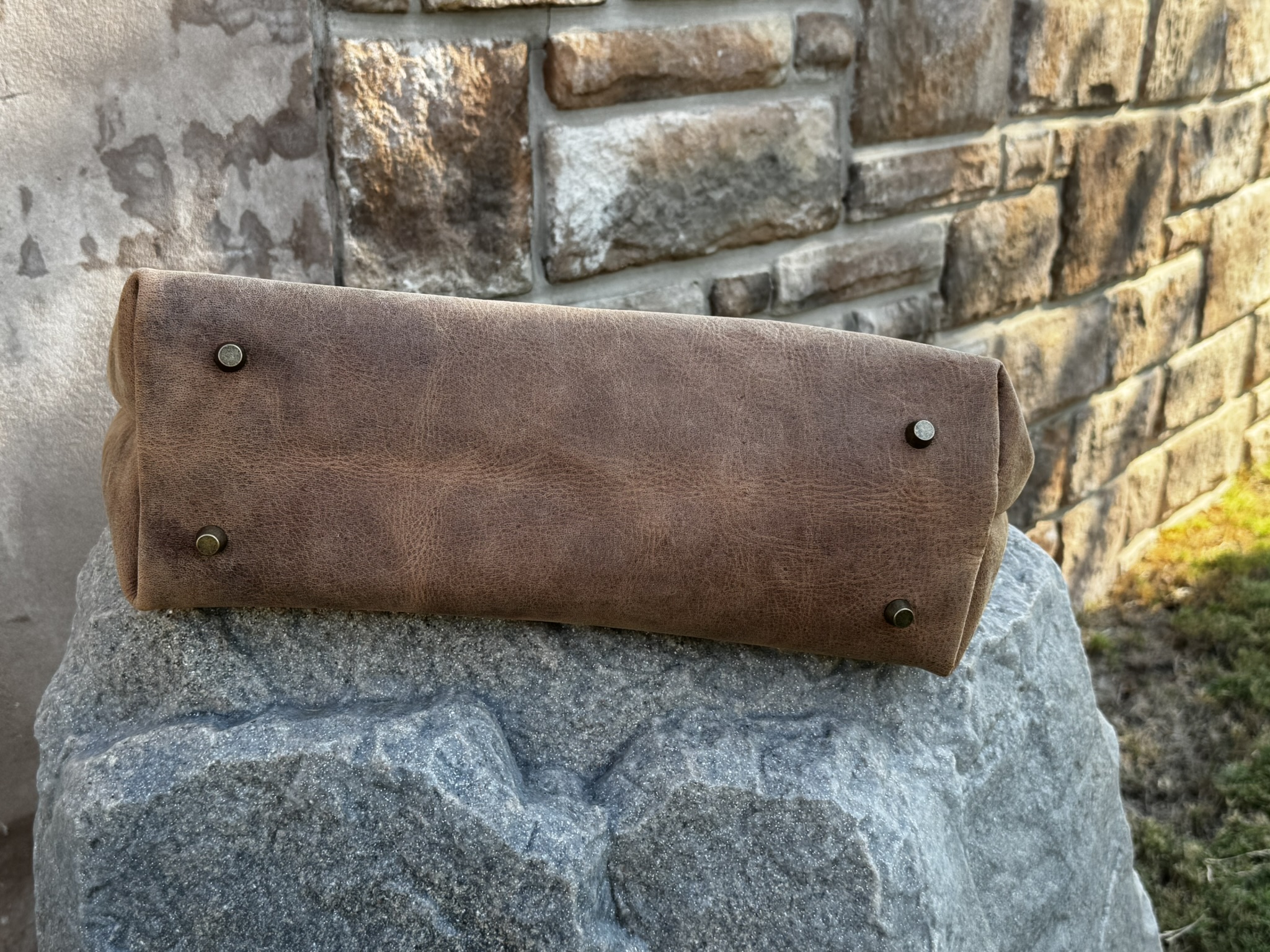 My favorite part of this tote is the buffalo leather. It reminds me of everyone’s much loved rough and tumble cowboy from Yellowstone. Like Rip, this bag ages well and some rough and tumble treatment will only add to its character. Hand cut and hand stitched, this beautiful leather tote will carry 3 ring binders and other large books easily. Handles are securely riveted in place. The brass feet help keep the bag from falling over, and the magnetic closure is easy to operate. Get the tabs close and it’s closed! Great for amputees or those with tremors.